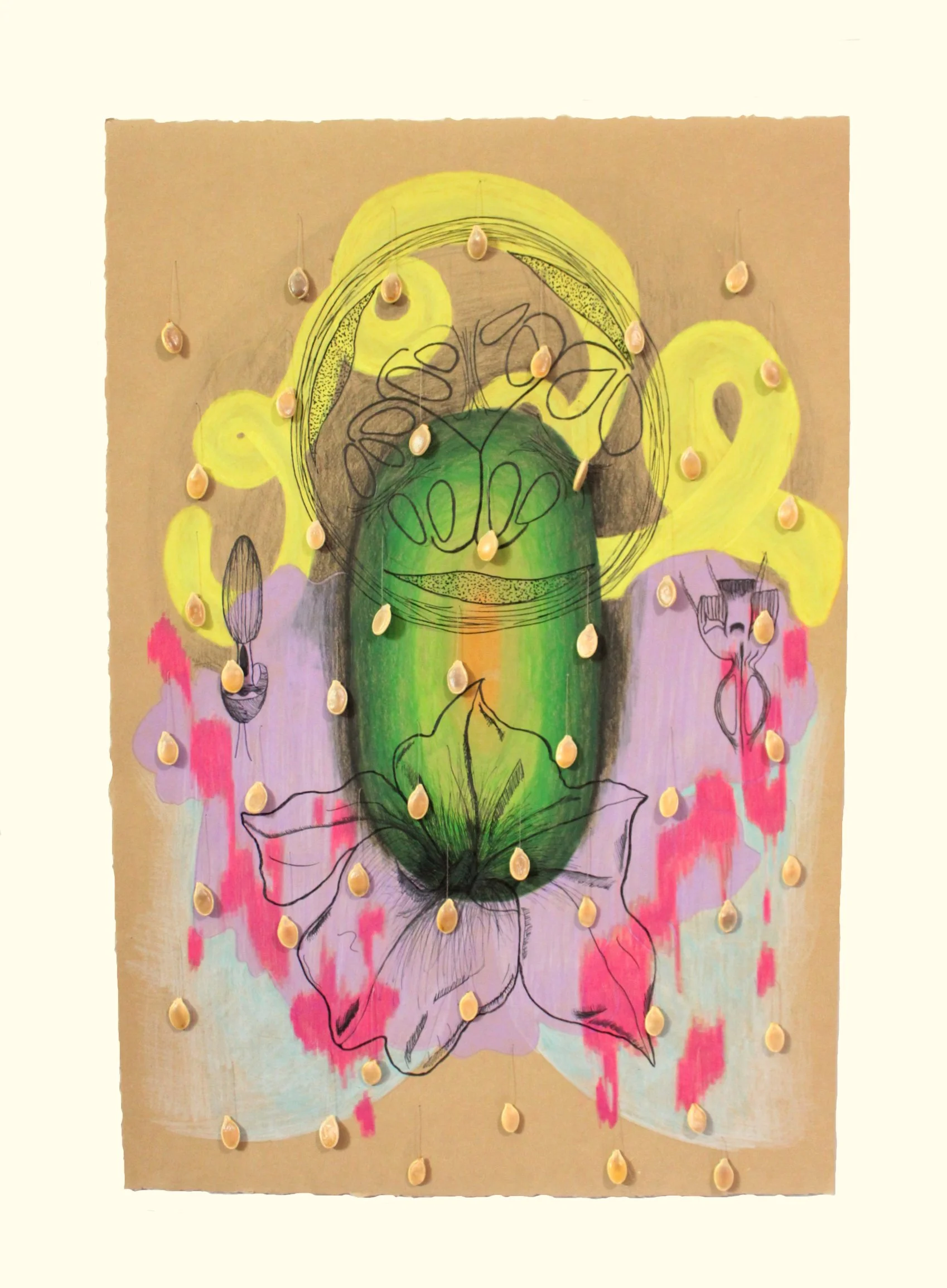 All of the illustrations in this series are 15” x 22”, colored pencil and ink on paper with cotton thread holding that specific plants seeds or roots. Title contains the arawak / taino name, english name and latin or scientific name. Series 2024 - 2025